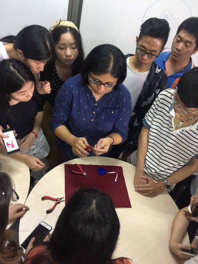 本次手工实作课程由具有多年手做经验的赖妙芬老师进行现场教学和指导,同学们先通过观看赖妙芬老师的操作技法和步骤再进行自己的创意发挥,将普通的合金线扭出不同的花样,赋予普通的挂坠新的美感。在手作过程中,同学们发现“看时易,做时难”,对于实际线条的扭转和工具的操作远不如自己听讲来的简单,需要经过耐心细致地操作才能完成好一件手作作品。有了之前的经验,也让同学们在制作玫瑰戒指时比之前轻松许多。最后,同学们都做出了自己满意的作品,也纷纷感叹手作的精妙与不易。