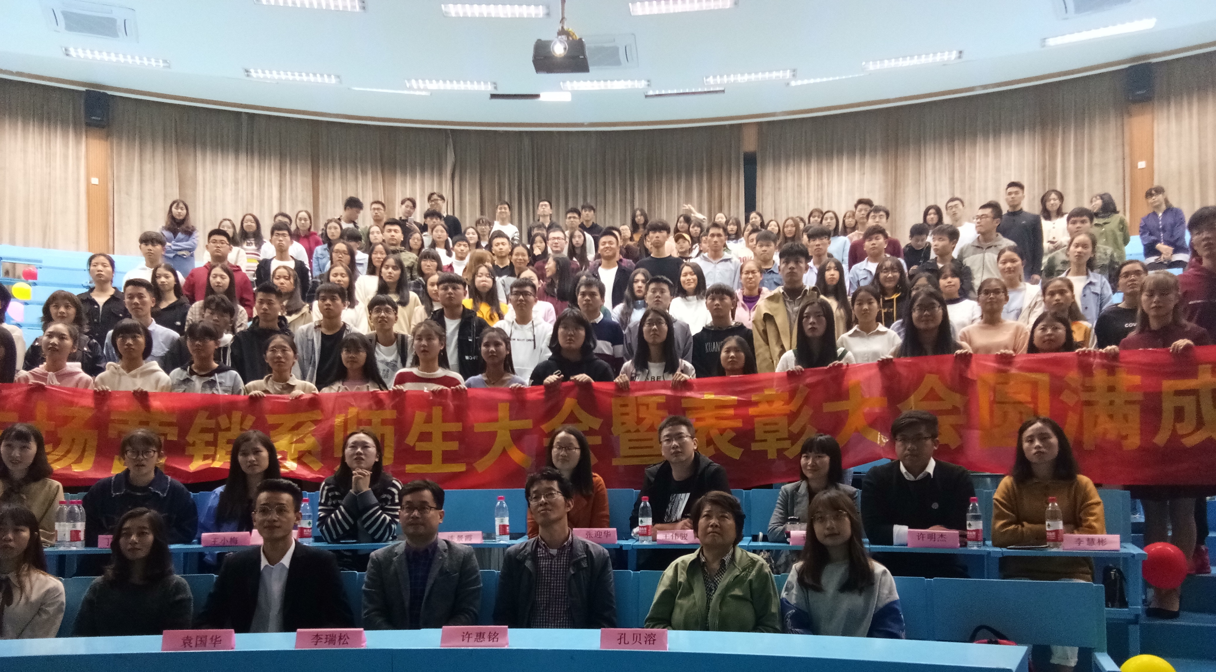 为了不断增强市场营销系的凝聚力,鼓励同学们再接再厉,11月29日晚上,市场营销系于第一教学区和昌教学楼求是讲堂举行师生大会暨表彰大会,beat365官方网站党总支书记兼常务副院长许惠铭、市场营销系主任李瑞松、全体专任教师和辅导员老师出席大会。