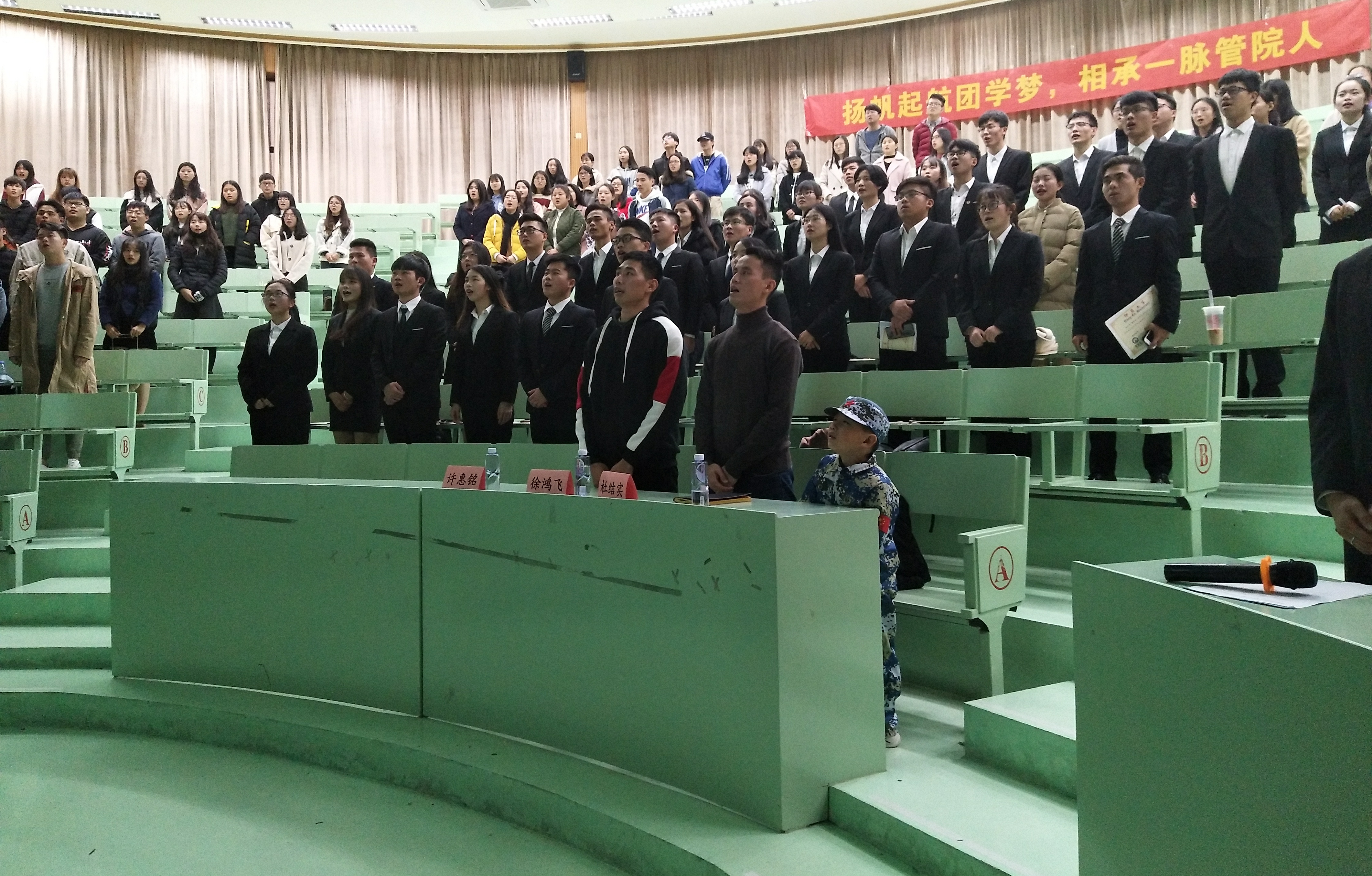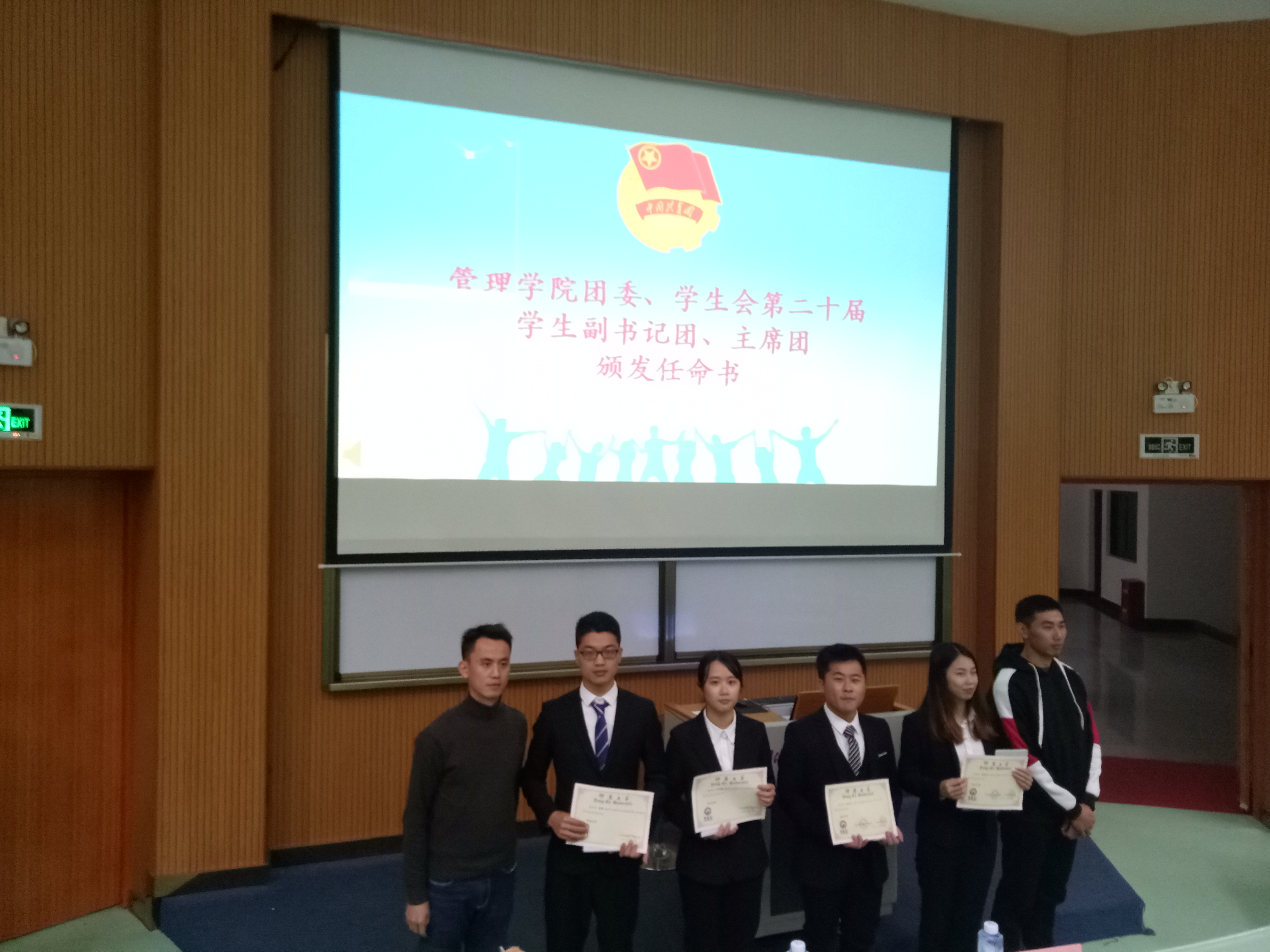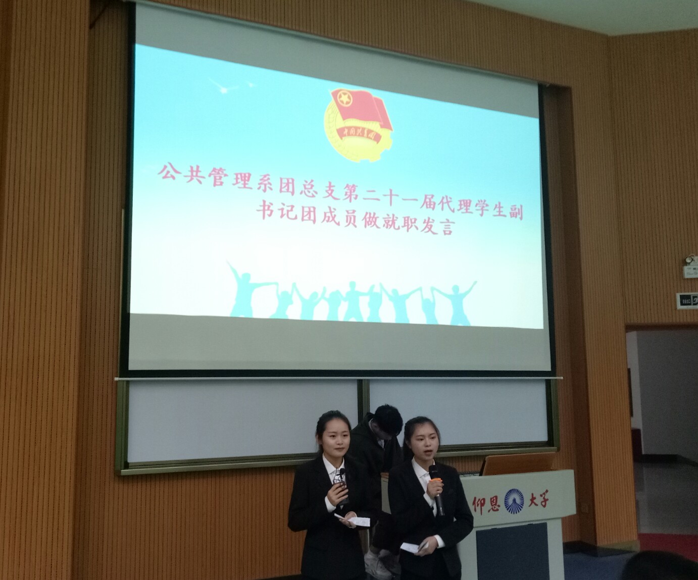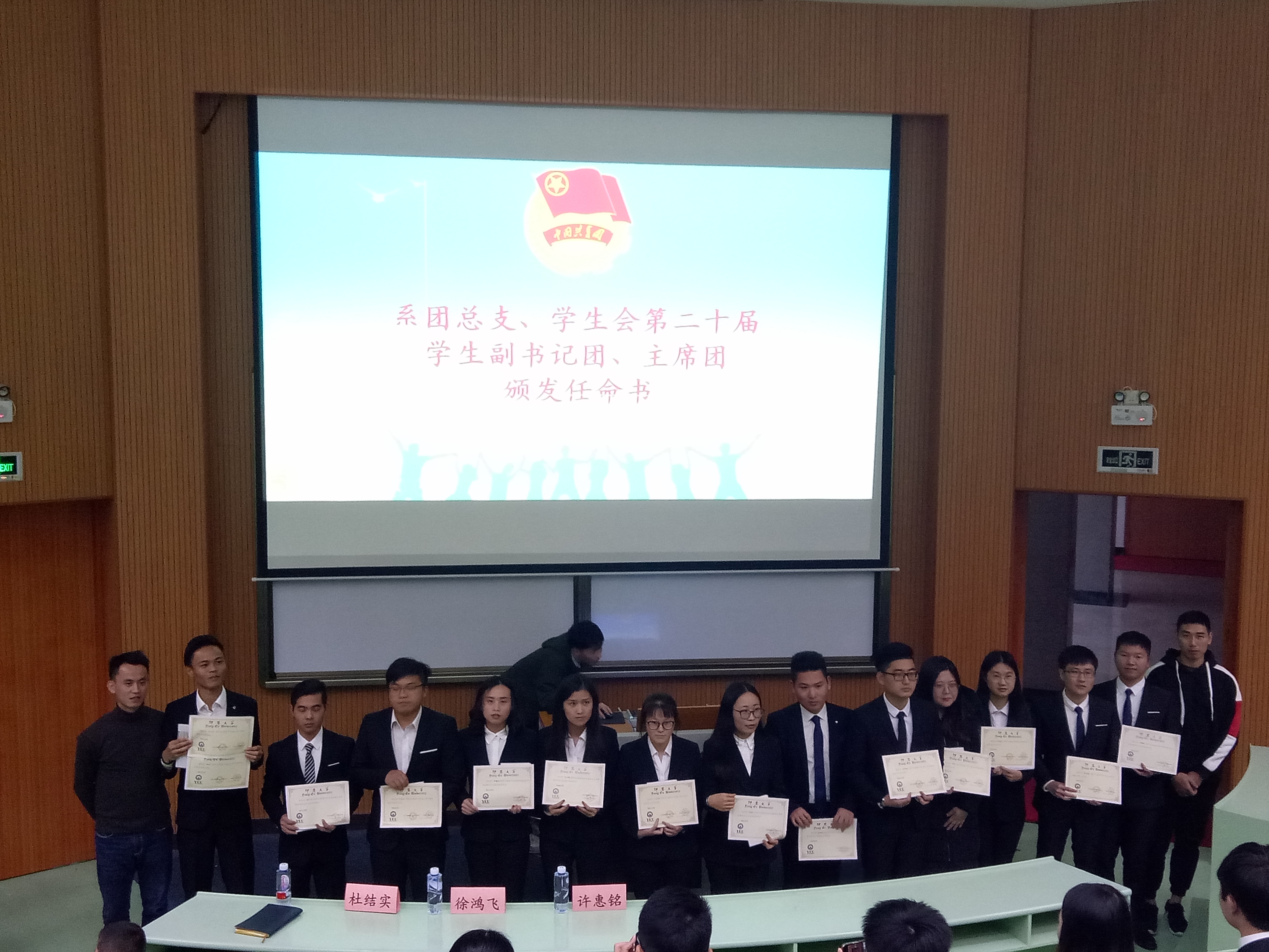 1月3日下午,beat365官网团学干部换届交接大会在第一教学区和昌教学楼乐之讲堂举行。beat365官网团委书记杜结实、公共管理系团总支书记徐鸿飞到场参加。