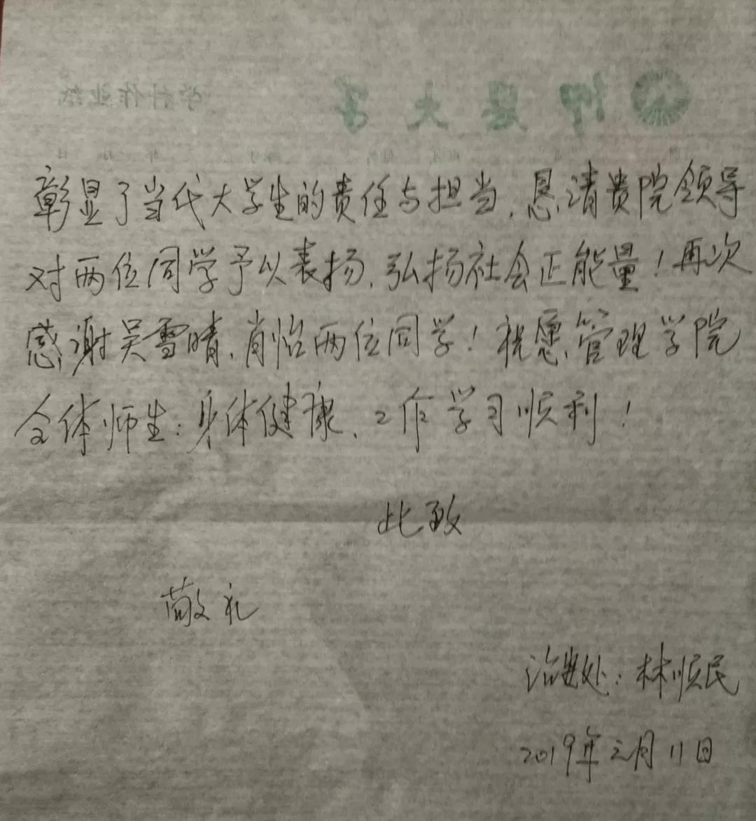 近日,beat365官网收到一封来自治安保卫处消防员林顺民的感谢信,表达对beat365官网2018级市场营销专升本的吴雪晴、肖怡的深切的感激之情。