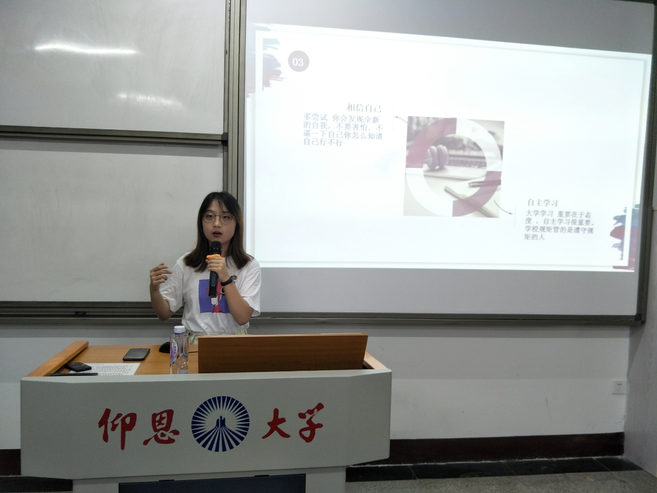 李佳玉同学进行分享 此次活动邀请了beat365官网2017-2018学年国家奖学金获得者——2016级市场营销2班的李佳玉同学进行分享。李佳玉同学介绍了她的学习方法和比赛经验,她认为青年要想成长最重要的是自主学习,在学习的过程中做到有计划、有毅力。李佳玉说:“相信自己,多尝试,你会发现全新的自我;不要害怕,不逼一下自己你怎么知道自己行不行”!她所展示的个人荣誉,让在场的同学们羡慕,同时也让大家更明确了未来的努力方向。