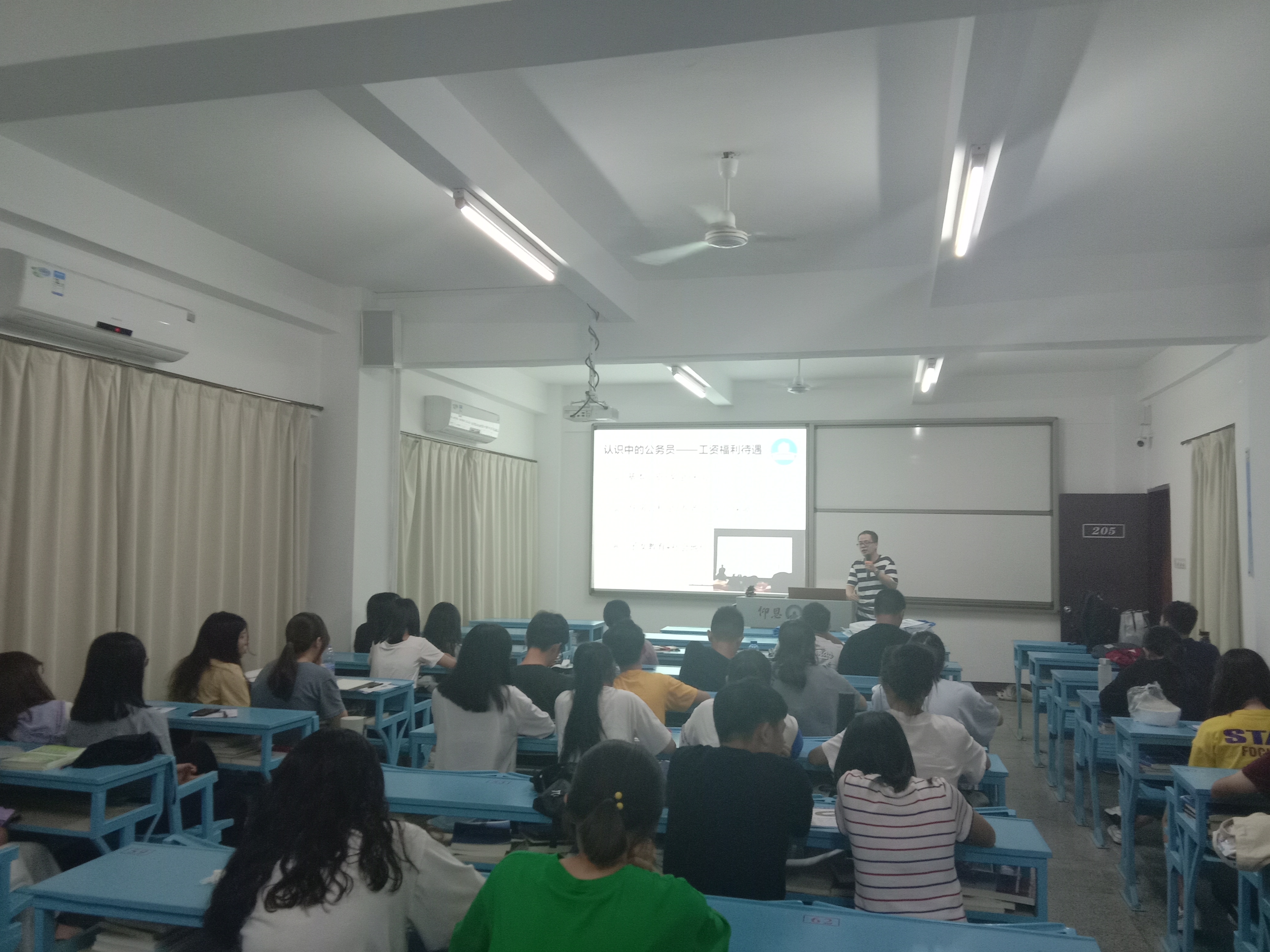 翁老师讲解 翁老师凭着自己积累的丰富经验和阅历向同学们分析了当今就业形势。他表示大学生毕业人数逐年增长,就业成了毕业生头疼的问题。如何突出重围、如何选择合适的职业、职业的薪资待遇怎么样等成为了毕业生们重点关注的内容。“大学生要有自己的职业规划,而公职类无疑是一个好的选择”翁老师如是说。同时,翁老师从多个角度和层次向同学们介绍了公职的福利、类型、备考方向、编制详情等。同学们听得津津有味,有很强的意愿继续深入了解。