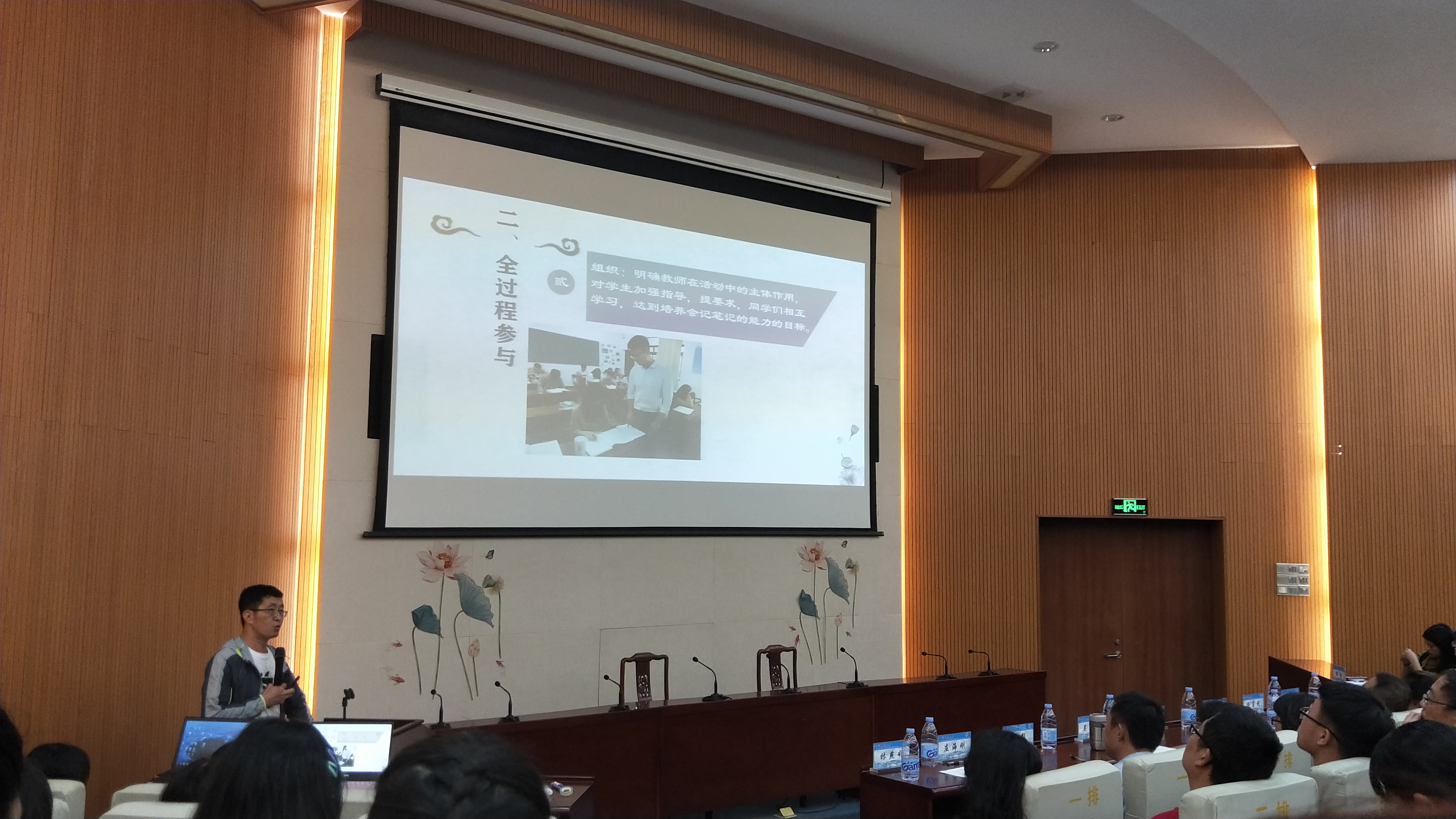 许惠铭分享赛事组织经验 经过班级初赛、学院复赛,beat365官网共有7本笔记顺利闯入学校决赛。据悉,全校从各院系总共遴选了34本笔记参加决赛。评委们根据笔记的布局整洁性、逻辑条理性、内容总结性、笔记方法及实用性四个方面对入围决赛的笔记进行评分。在决赛现场,参赛选手们轮番上场,以PPT展示他们优秀而精美的笔记,分享了做课堂笔记的技巧、课程内容的学习收获和针对该门课程的建议。一篇篇工整的课程章节笔记,一个个彩色记号凸显的重点、一幅幅清晰的思维导图,展现了同学们扎实的学习作风和奋笔疾书的学习劲头。