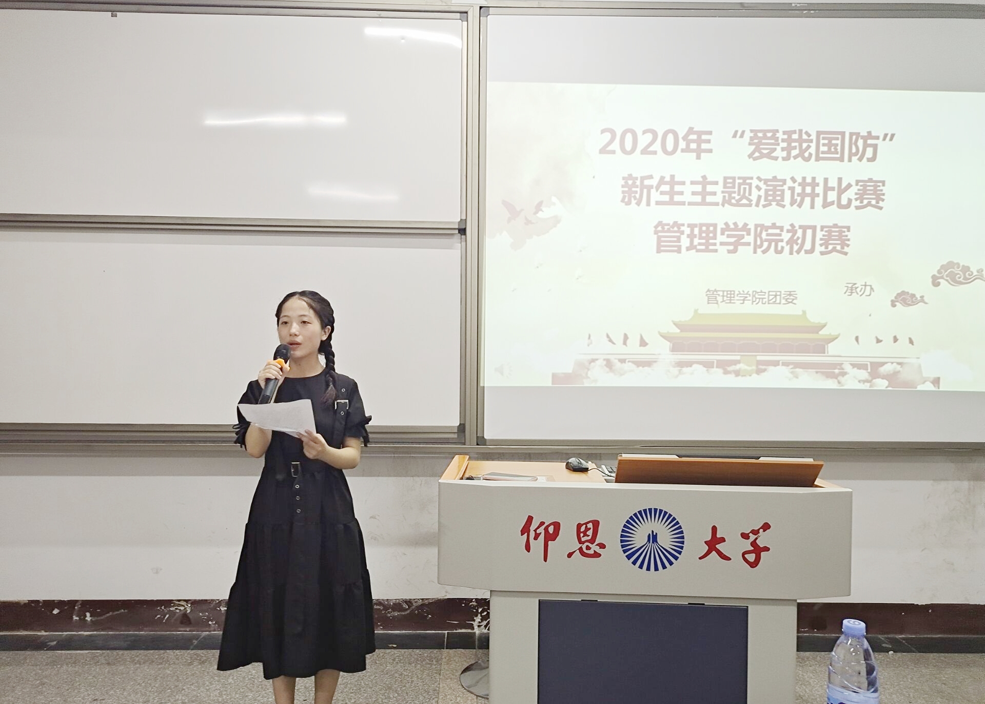 新生演讲 在比赛中,新生们就“爱我国防”展开系列演讲。新生们的演讲内容丰富,有借助我国历史引申出国防的重要性,有借助现实社会来描述中国国防的强大,亦有结合新冠疫情来讲述国防是全民性的。在比赛的结尾,杜结实老师就此次演讲比赛作出总结,并对获奖的同学们表示祝贺。