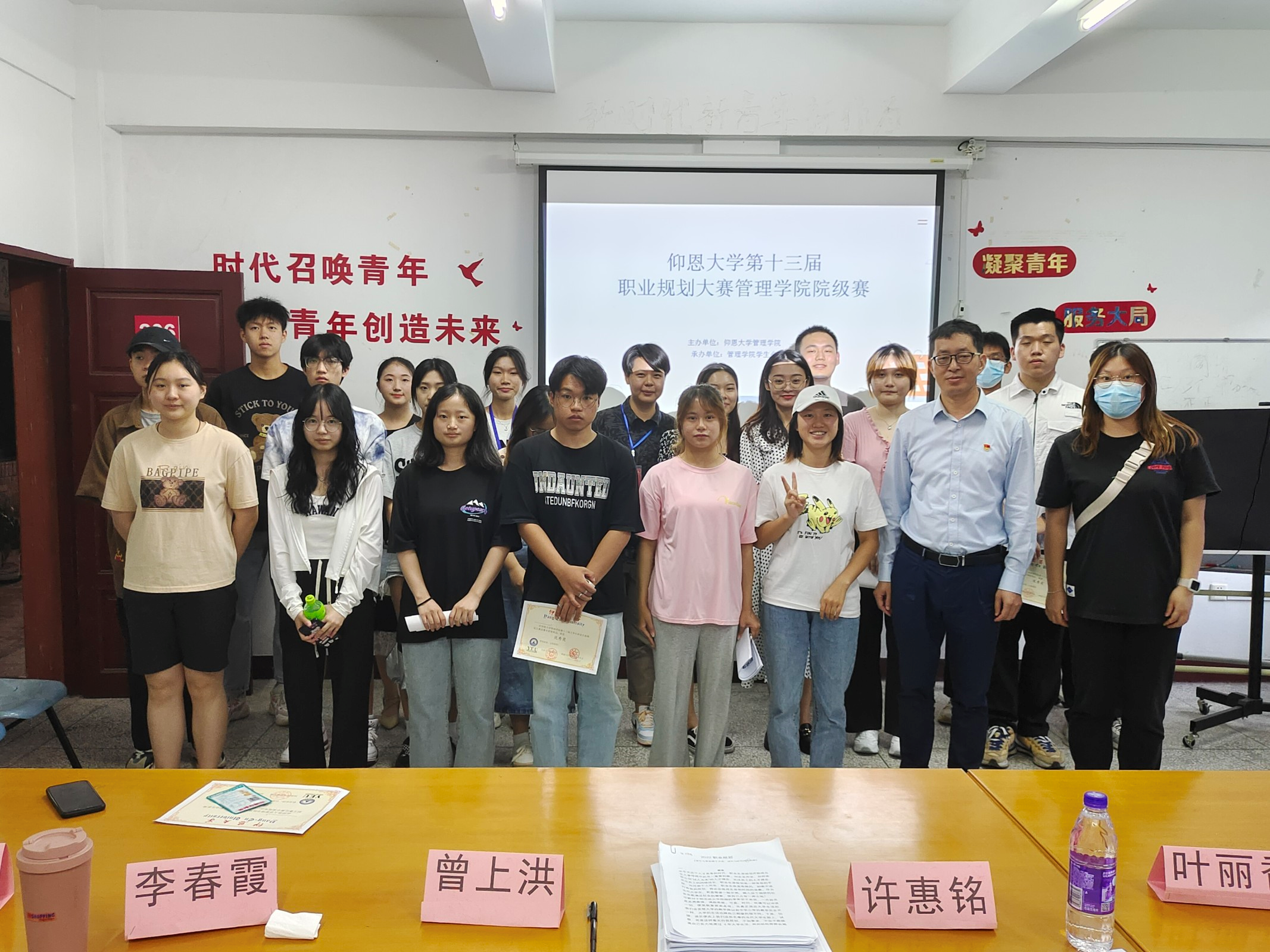 全体选手及工作人员合影留念 本次大赛,一定程度上消除了同学们对专业前景的迷茫,为同学们树立了正确的成才观、就业观和择业观。在传播普及职业规划理念的同时,也引导同学们学会科学定位自己的发展方向,充分认识自我、认清环境,积极应对就业形势的变化。