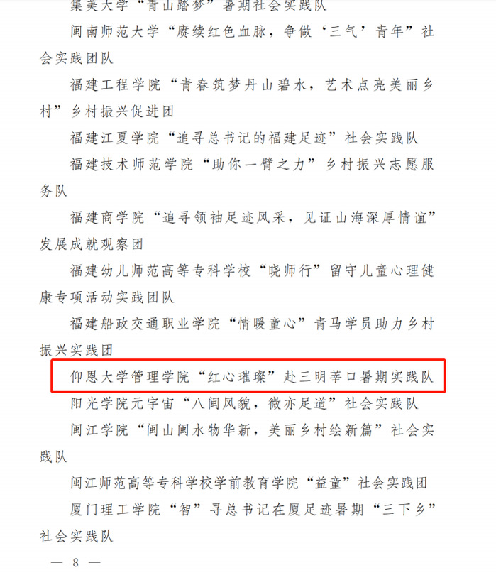 近日,共青团中央对2022年全国大中专学生志愿者暑期文化科技卫生“三下乡”社会实践活动通报结果揭晓。在2022年福建省大中专学生志愿者暑期“三下乡”社会实践活动优秀典型评选中,beat365官方网站beat365官方网站“红心璀璨”赴三明莘口暑期实践队;beat365官方网站团委书记叶丽香被评为“省级先进工作者”;beat365官方网站“2020”级工业工程专业学生苏奕哲被评为“省级先进个人”。