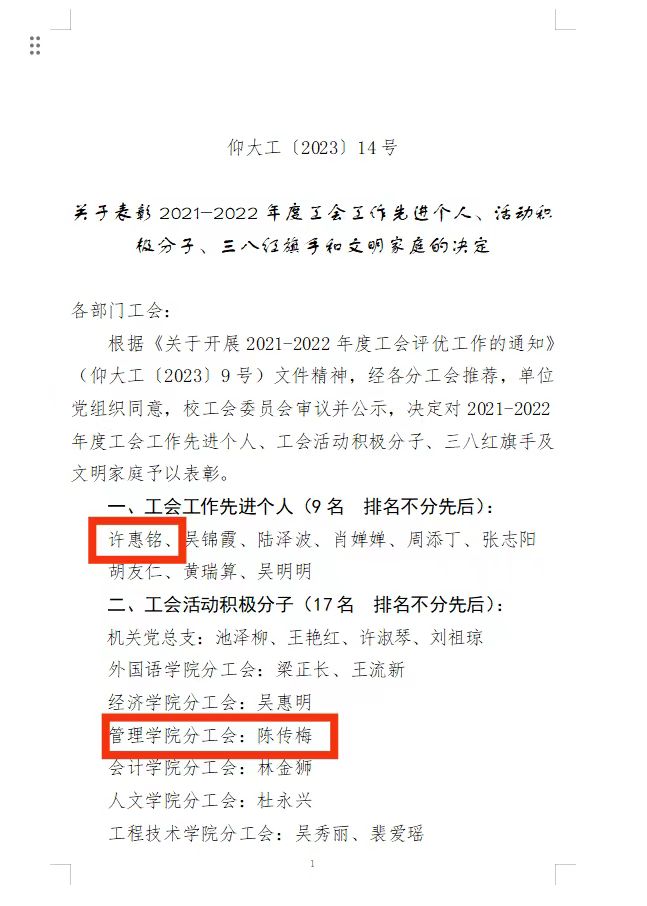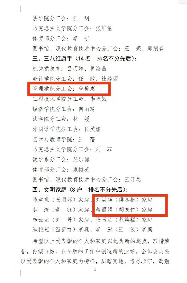 9月8日,校工会对过去一年在工会工作中做出突出贡献的教职工进行了表彰,beat365官网许惠铭老师获工会工作先进个人、陈传梅老师获工会活动积极分子、曾勇惠老师获三八红旗手、刘洪华(侯冬梅)家庭、蒋丽娟(胡友仁)家庭获文明家庭荣誉称号。获表彰的老师们表示,他们将以此为新的起点,珍惜荣誉,再接再厉,在今后的工作中创造新的业绩!