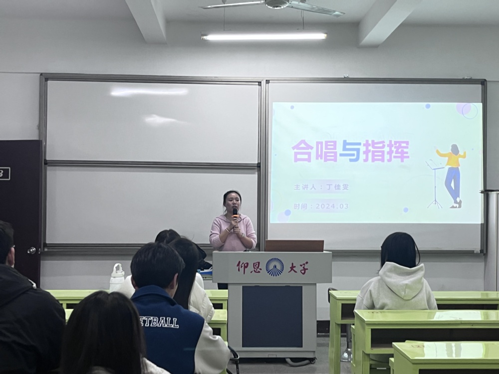 本次会议由物流管理系团总支书记丁佳雯老师主持,丁佳雯老师从指挥的基本技术和音乐中的起伏出发向指挥员们讲解了作品的艺术处理形式,细致的讲解了站姿,着装,体态,手势等方面的知识,强调了指挥员应该将音乐感染力和丰富的音乐表现力,这样才能将合唱队员带到音乐作品所需要的意境之中,积极主动地诊释音乐作品,从而使观众受到感染。同学们认真听讲,领会指挥员应具备的能力,会议过后,丁佳雯老师对全体指挥员单独进行了指导,耐心的回答了同学们对指挥的疑问。