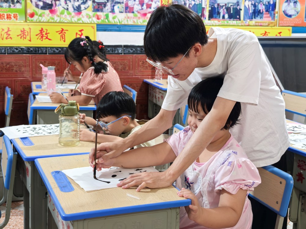 【实践】实践队队员指导孩子毛笔字笔画