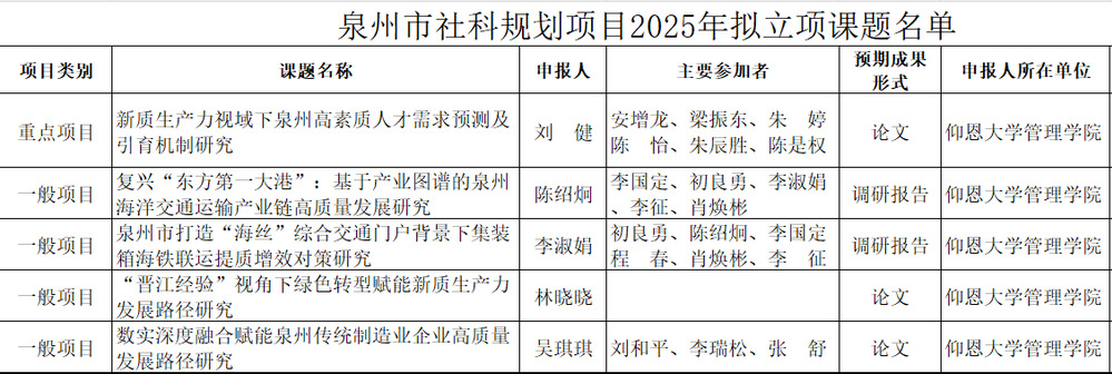 近日,泉州市社会科学界联合会公示了2025年泉州市社科规划项目拟立项课题名单。beat365官网5项课题喜获立项,其中重点项目1项、一般项目4项,充分展现了学院在管理学领域的科研实力与创新活力。