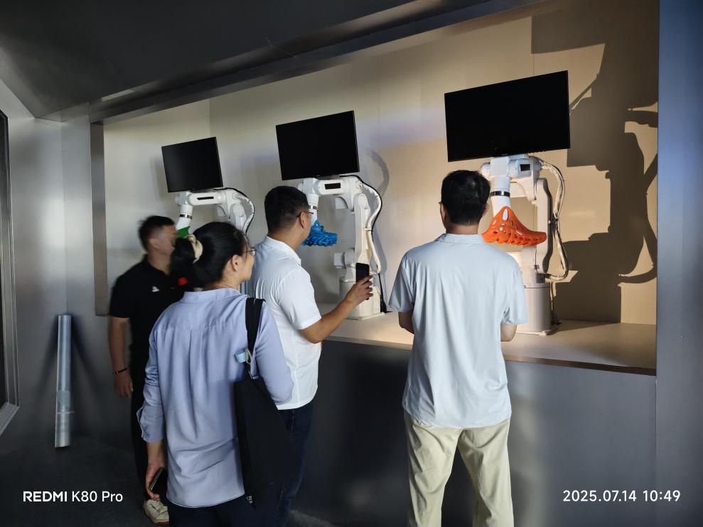 在企业代表的带领下,考察组首先来到匹克国际中心的品牌馆。该区域总面积达1500平方米,讲解员罗书明详细介绍了匹克的品牌发展历程、核心技术产品以及全球化布局的成果。馆内配备了先进的运动产品检测设备、3D设计软件系统及多媒体教学设备,能同时容纳50名学生开展实习活动,完全满足不同专业实习教学的空间与设备需求。考察组一行还实地查看了鞋业生产线,在讲解员连清彬的细致介绍下,深入了解了生产流水线的运作流程,直观感受了企业的生产制造环节。