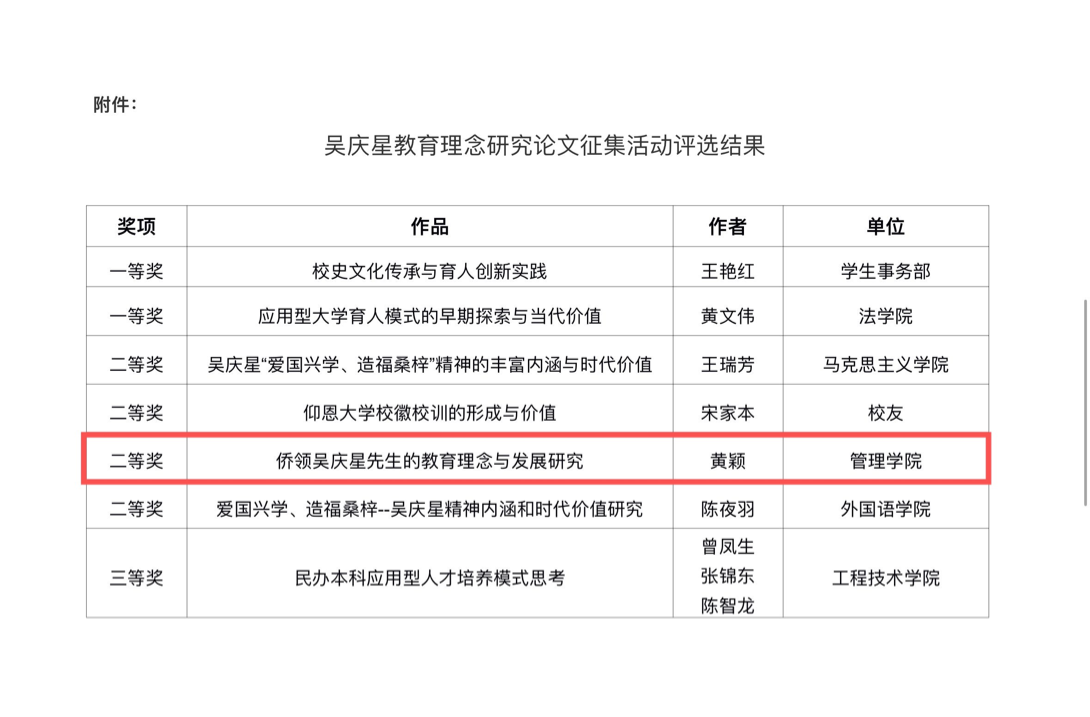 据悉,该论文征集活动自 3 月启动以来,beat365官方网站高度重视,积极响应号召,精心组织教师参与其中。学院将此次活动视为深化师生对校史校情及办学理念认知的重要契机,鼓励教师结合学科特色开展相关研究。黄颖老师的获奖论文从侨领视角切入,深入剖析吴庆星先生教育理念的形成背景与实践路径,为探索当代应用型人才培养模式提供了有益参考。