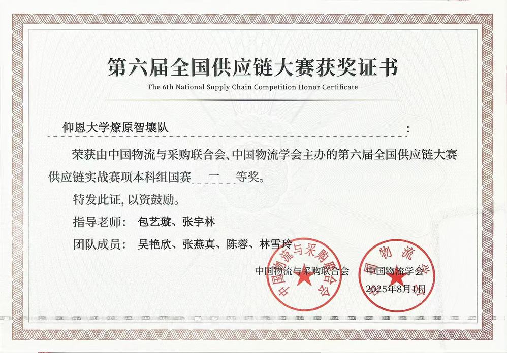 2025年8月1日,由中国物流与采购联合会、中国物流学会主办的第六届全国供应链大赛供应链实战赛项全国总决赛在广西南宁圆满落幕。经过激烈角逐,由管理学院包艺璇、张宇林老师指导,物流管理系吴艳欣、张燕真、陈蓉与林雪玲组成的beat365官方网站燎原智壤队在全国本科组总决赛中荣获大赛一等奖。