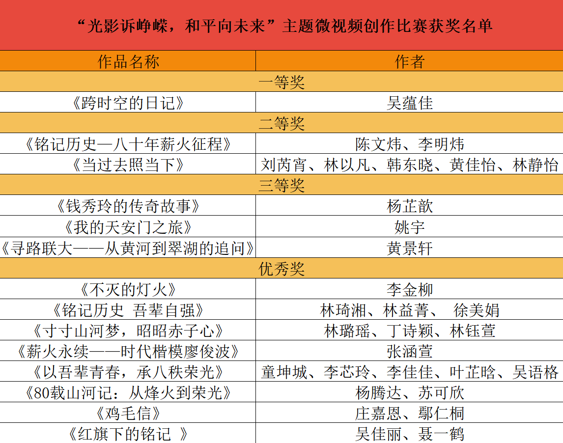 作为党建育人的创新实践,本次比赛以赛促学、以影寄情,引导广大青年在影像创作中深刻感悟历史、自觉传承精神。参赛作品凝聚着对历史的敬畏与报效祖国的志向,生动展现出新时代青年昂扬奋进的青春风貌,更传递出他们以赤诚爱国之心共绘中华民族伟大复兴斑斓画卷的坚定信念与拳拳决心。
