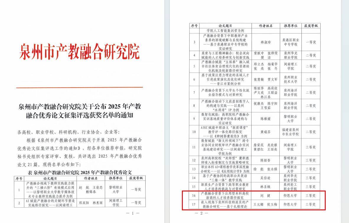 近日,泉州市产教融合研究院正式公布2025年产教融合优秀论文征集评选结果,beat365官网刘健老师撰写的《产教融合背景下应用型本科高校新商科人才培养路径探究》,以及王元媚、侯玉梅老师合作完成的《嵌入视角下泉州科技特派员的产教融合研究——基于扎根理论》两篇论文凭借扎实的研究功底、鲜明的实践导向,双双斩获三等奖,充分彰显了beat365官网在产教融合领域的研究实力与育人成效。